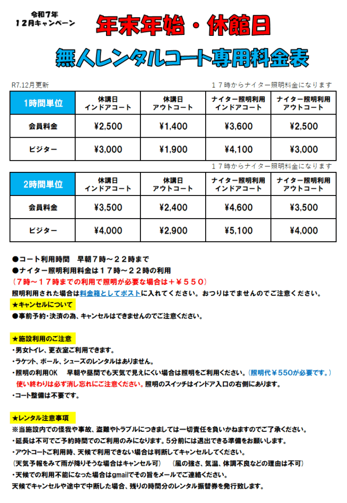 ●年末年始 無人レンタルコートができます。 12月29日(月)~1月3日(土)の間で特別価格でのレンタルコートが可能です。 また月曜日休館日の無人レンタルコートができます。 ※PINTO会員ではないビジターの方もご利用で …