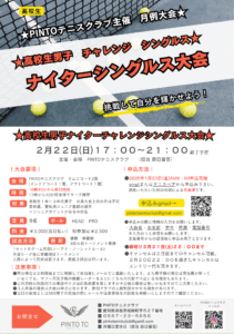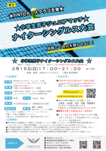 ★2月ジュニア月例大会の情報★ / 最新情報 / By PINT TC ★ジュニア大会の情報です。 ■2月15日(日) 小学生男子シングルス大会 17:00~21:00終了予定 ■2月22日(日) 高校生男子シングルス大会 17:00~21:00終了予定